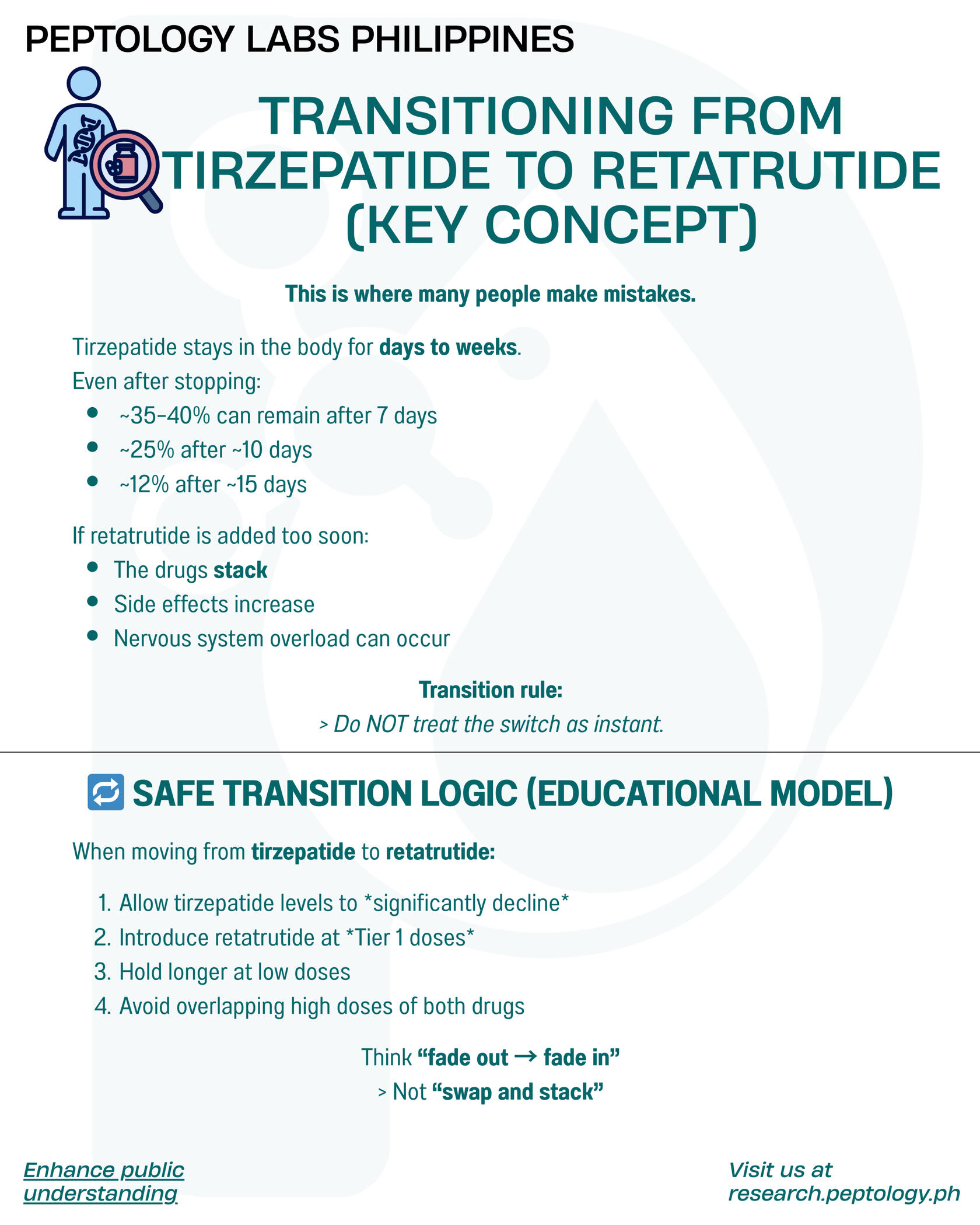 π SAFE TRANSITION LOGIC (EDUCATIONAL MODEL)When moving from tirzepatide β retatrutide:1οΈβ£ Allow tirzepatide levels to decline